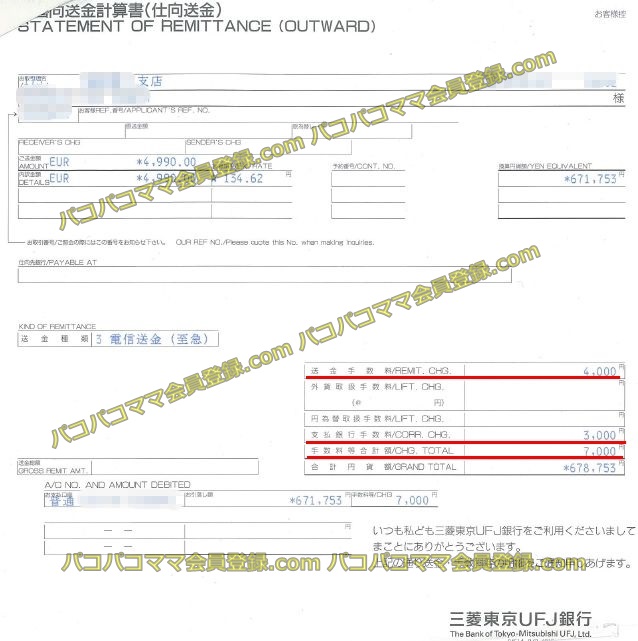 この送金書の赤線を引いた手数料の部分を見ると、