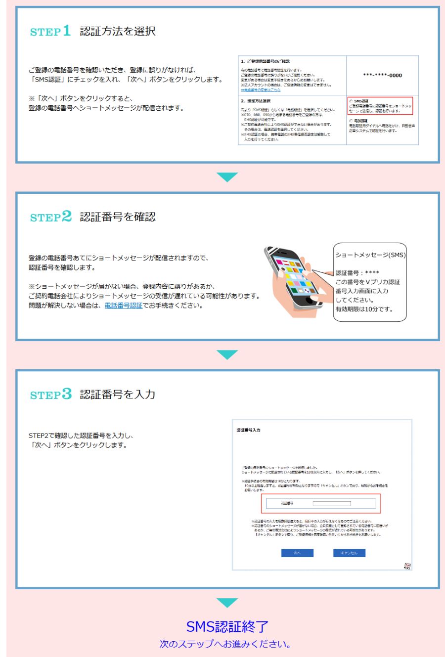 - SMS認証はショートメッセージ(SMS)で送られてきた認証番号を入力