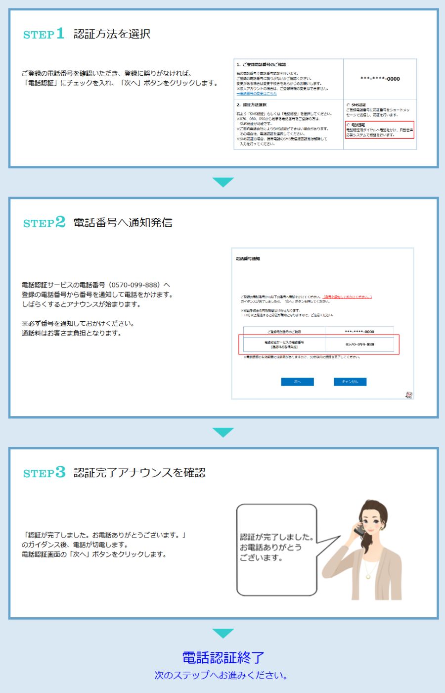 - 電話認証は電話認証サービスの電話番号(0570-099-888)へ電話をかけます。(通話料がかかります)