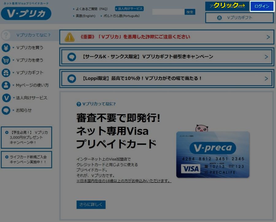 Vプリカ公式サイトを開いて下の図のようなVプリカ公式サイトに移動したら、ページ右上の「ログイン」ボタンをクリックしてください。