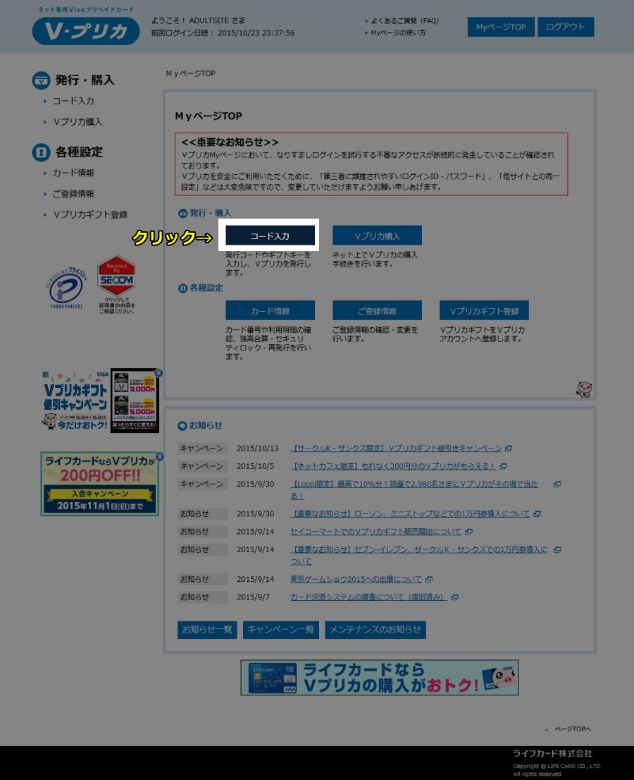 「ログイン」ボタンをクリックして下の図のようなMyページ画面に移動したら、「コード入力」ボタンをクリックしてください。