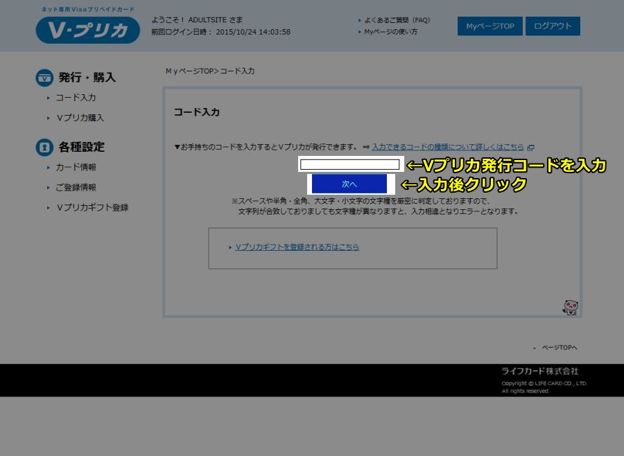 「Vプリカ発行コード」が書かれたレシートを入手したら、Vプリカ公式サイト上でVプリカの発行を行います。
