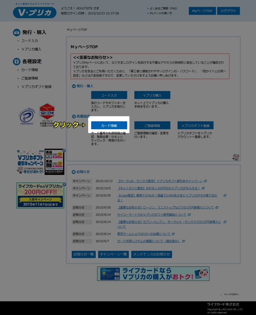 Vプリカ公式サイトのトップページからログインしMyページ画面に移動し(やり方は上記のpoint1〜point2参照)、「カード情報」をクリックしてください。