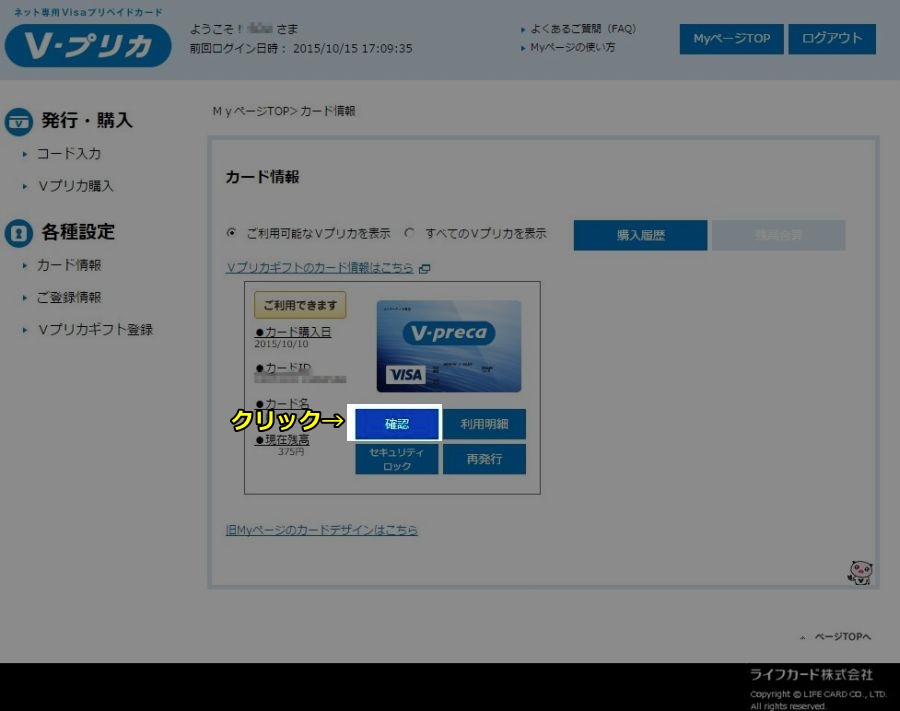 「ご利用できます」になっている場合は、そのカードのカード番号を確認しますので「確認」をクリックしてください。