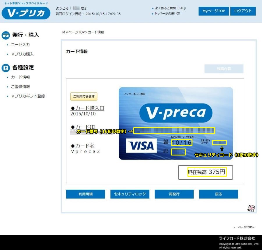 「確認」をクリックすると下の図のようなカード情報画面が出るので、