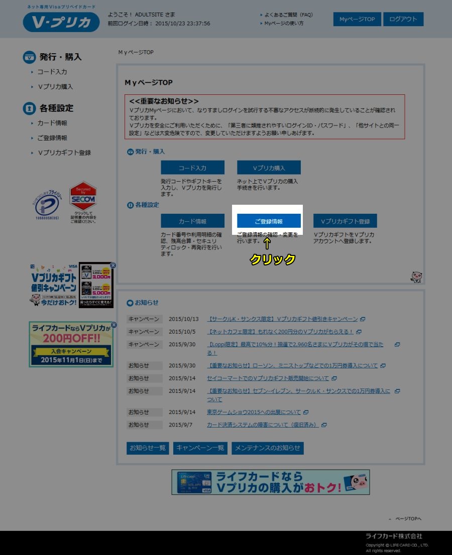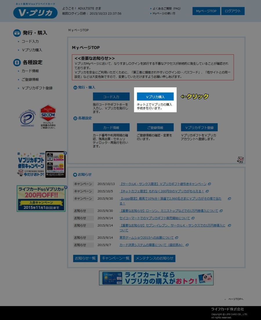 「ログイン」ボタンをクリックして下の図のようなMYページ画面に移動したら、「Vプリカ購入」ボタンをクリックしてください。