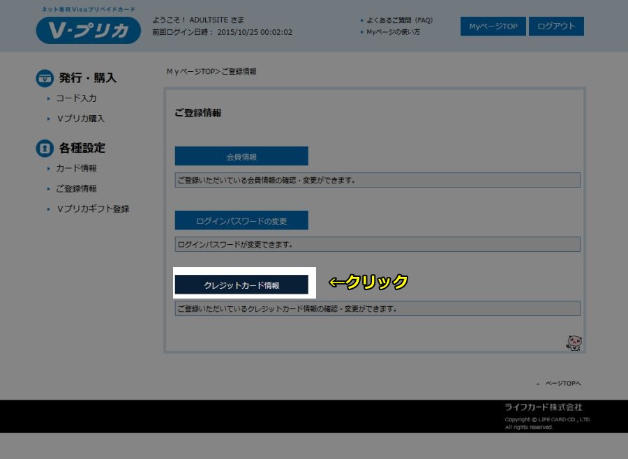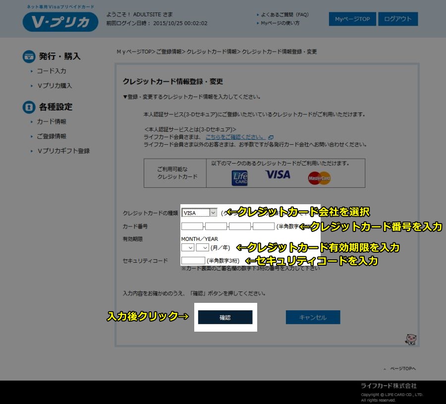 - クレカ会社を選択(利用できるクレカ会社はライフカード、VISA、Mastercardです)