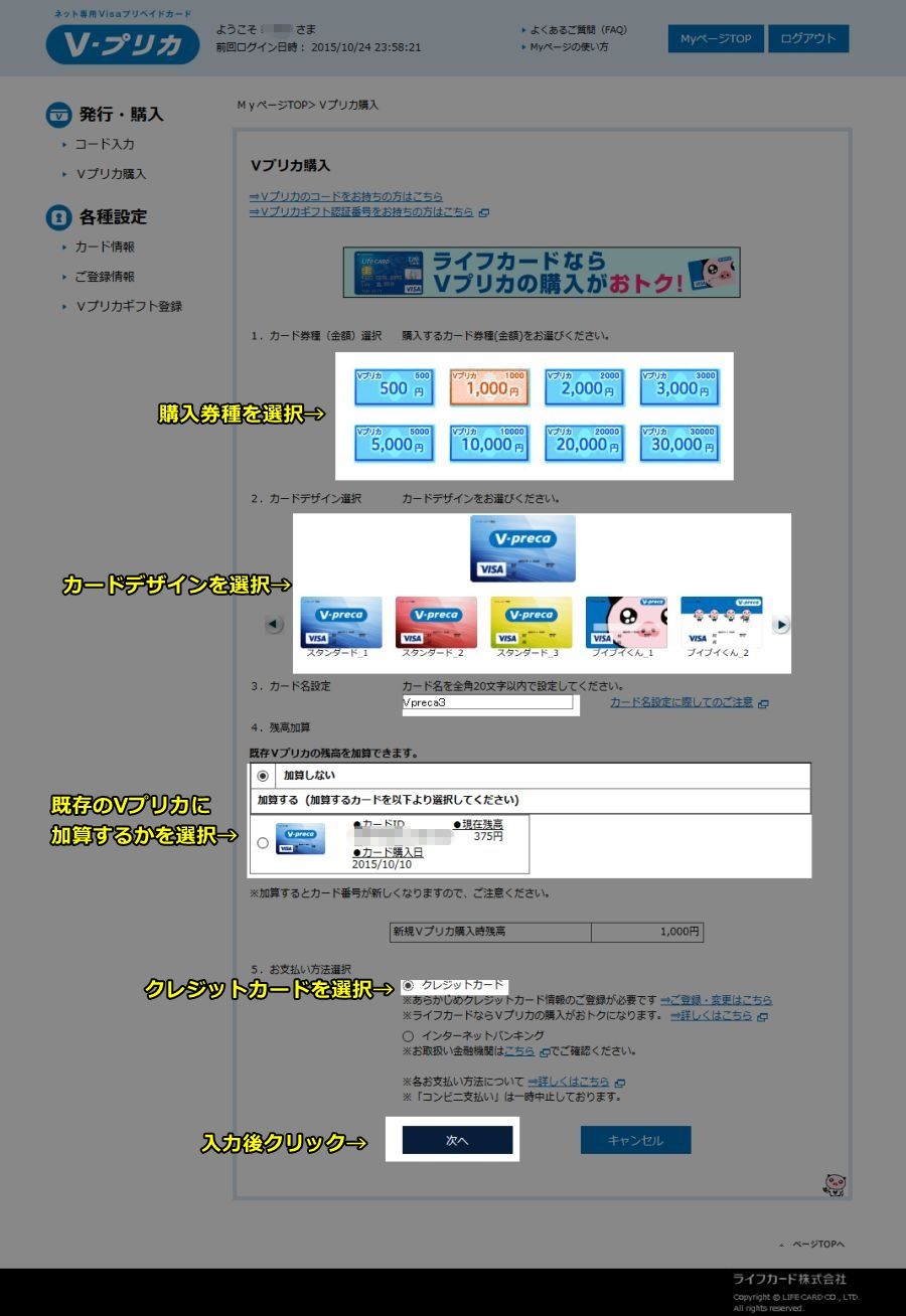 - 既存Vプリカに残高を加算するかを選択