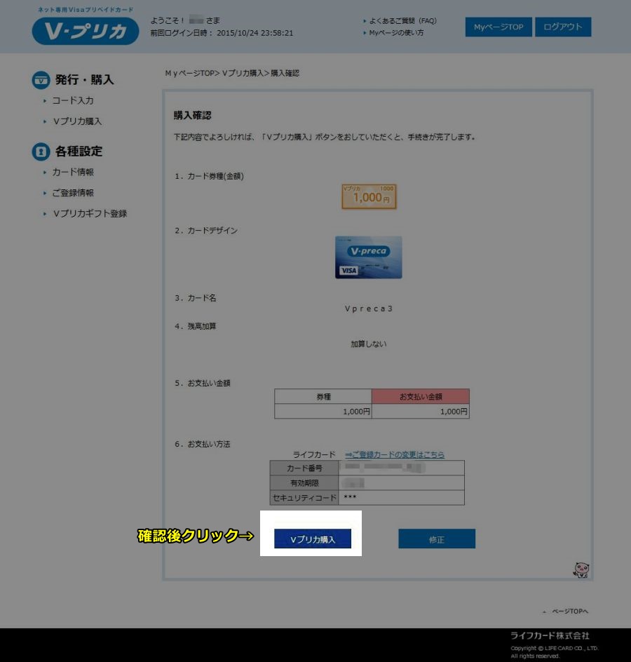 「Vプリカ購入」ボタンをクリックして下の図のような購入画面に移動したら、