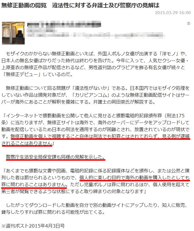 「無修整固定料金制サイトパコパコママのモザイクなしAVを見ると法律違反でたいほされることはないの?」