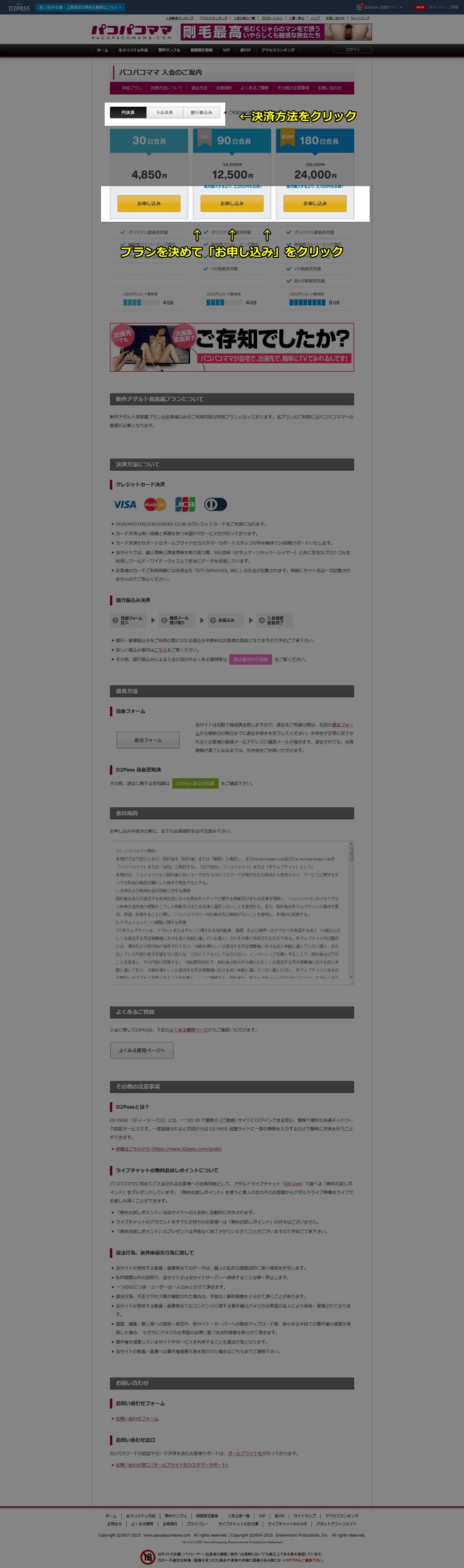 パコパコママ公式サイトの入会案内ページに移動し、決済方法をクリックして選択し、各プラン説明の下に「お申込み」と言う黄色いボタンが表示されていますので、入るプランを決定したら「お申し込み」をクリックして下さい。
