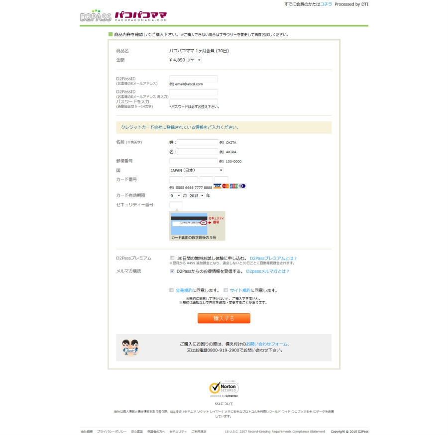 入るプランを決定したら「お申し込み」をクリックするとしたのような画面に行きますので契約情報(E-mail,パスワード)、クレジットカード情報を入力します。パスワードは忘れないようにメモに控えておきましょう。入力したら、「会員規約に同意します」「サイト規約に同意します。」にチェックを入れて「購入する」をクリックします。